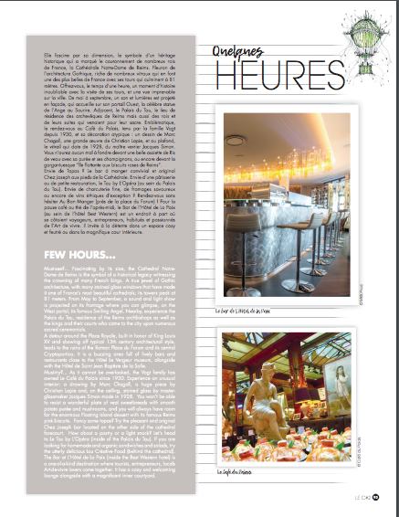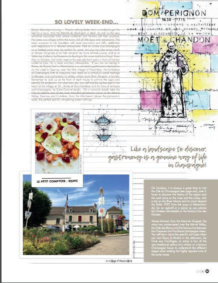 Rédaction de dossiers thématiques et Interviews pour 2 éditions du Magazine. Itinéraires en Champagne (Illustré par l'artiste IEMZA), le lancement de L'Hôtel Royal Champagne & Spa, ...